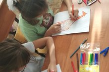 На занятиях по рисованию была тема "Жираф". Сначала соединили пунктириные линии. А потом добавили горизонт и растительность. А уже потом ребята ракюскрашивали картинку карандашами, фломастерами и красками по желанию.