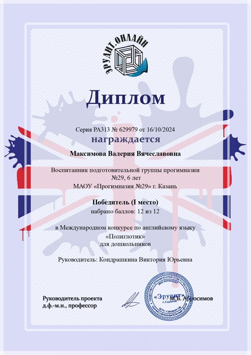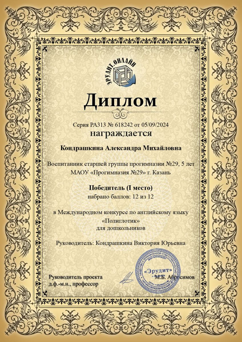 Кондрашкина Александра (5 лет) и Максимова Валерия (6 лет) обучающиеся детского сада прогимназии, заняли 1 место, набрав 12 баллов из 12, в Международном конкурсе по английскому языку "Полиглотик " для дошкольников организованном ЭРУДИТ.ОНЛАЙН. Руководитель: Кондрашкина Виктория Юрьевна.