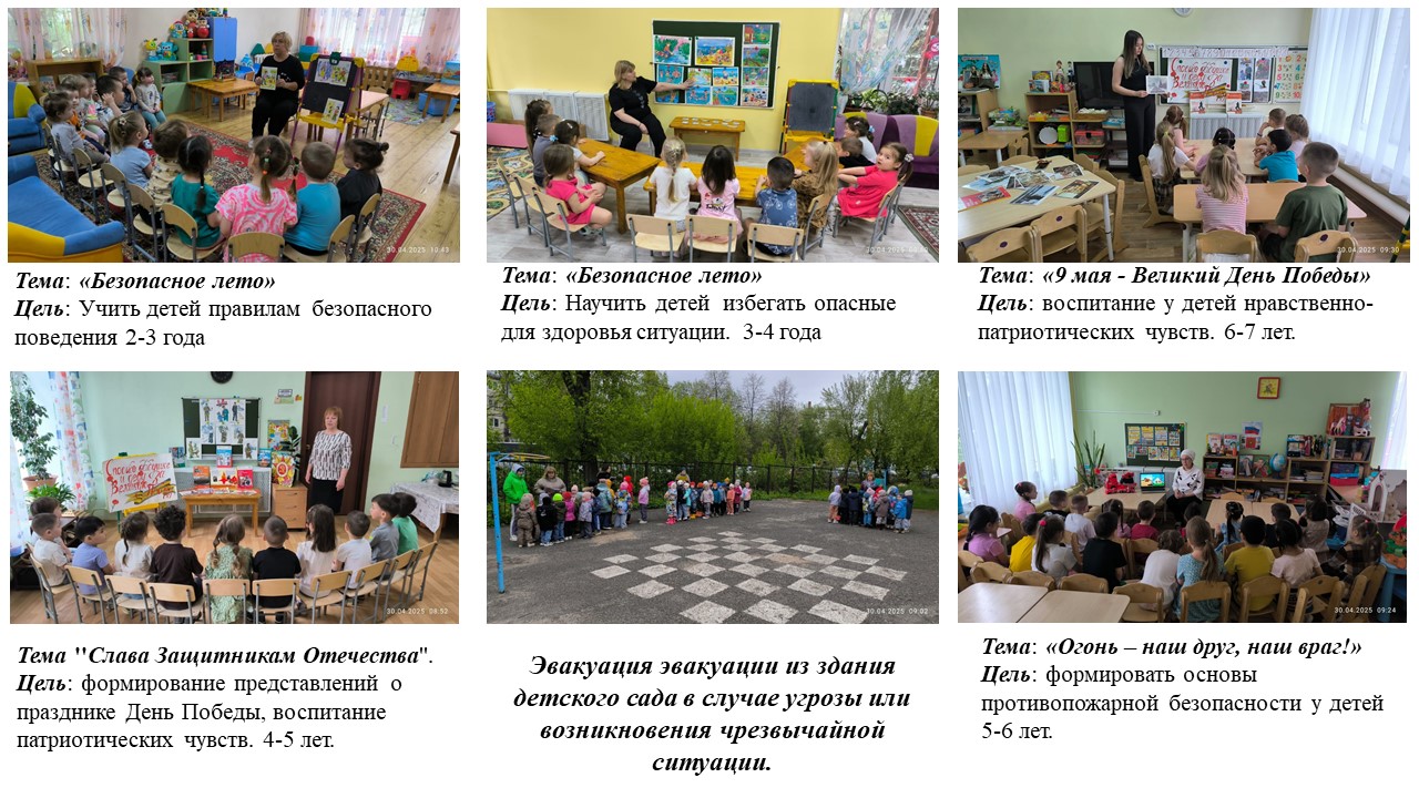 Опубликовано: 30.04.2025В рамках проведения Всероссийского открытого урока по предмету «Основы безопасности и защиты Родины» в Республике Татарстан во всех группах детского сада прогимназии были проведены занятия, а также тренировки по эвакуации детей при различных чрезвычайных ситуациях