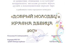 Поздравляем ученика 9б класса Антонович Родиона и классного руководителя Есину Татьяну Васильевну с номинацией "За ценностное отношение к культурно-историческому наследию русского народа, дружбе и взаимопониманию народов мира" на районном этапе городского конкурса "Добрый молодец 2017".