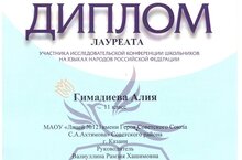 Обучающаяся 11 класса нашего лицея Гимадиева Алия (руководитель – Валиуллина Рамзия Хашимовна) стала лауреатам в секции «Татарская филология». Поздравляем!!! Желаем дальнейших успехов!