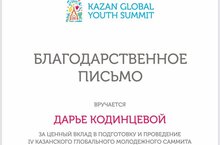За ценный вклад в подготовке и проведении IV Казанского Глобального Молодежного Саммита Дарью Кодинцеву, ученицу 10Б класса (кл.руководитель: Валиуллина Р.Х.), наградили Благодарственным письмом от Помошника Раиса Республики Татарстан, Председателя совета регионального отделения Совета Первых Республики Татарстан Т.Д.Сулейманова.