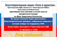 Приглашаем вас принять участие в благотворительной акции, приуроченной ко Дню защитника Отечества! ???? 21 февраля В Трехозерском СДК пройдет праздничный концерт, во время которого будет действовать благотворительная ярмарка. Каждый житель села сможет внести свой вклад в данную ярмарку. ???? Все собранные средства будут направлены на гуманитарную помощь для СВО от нашего родного села 09.02.2026