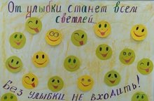 И был оформлен плакат "Без улыбки не входить"-ребята прикрепляли смайлики, которые подходили им по настроению.