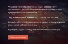 11 октября 2022 года состоится Всероссийская образовательная акция "Всероссийский экономический диктант", принять участие в мероприятии можно в школе. Тема акции "Сильная экономика- прооцветающая Россия!" Каждый участник получит возможность оценить и повысить свои знания по экономике! Можно принять участие в дистанционном формате, подробная информация на сайте организатора https://diktant.org/
