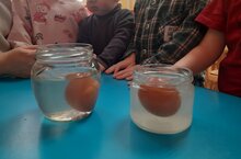 - В рамках тематического дня, посвящённого Дню науки в России с нашими детьми проведен эксперимент с яйцом в воде, демонстрирующий свойства жидкости и иллюстрирующий принцип Архимеда: на тело, погружённое в жидкость, действует подъёмная сила, равная весу вытесненной жидкости. Все с интересом наблюдали как в пресной воде яйцо тонет.