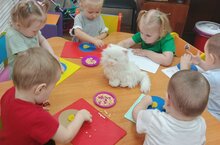 Сегодня в первой младшей группе прошло занятие по лепке "Вкусный пирог для кошечки". Наши малыши учились сплющивать пластилиновый шар между ладоней, придавая ему форму лепёшки, а также украсили изделия с помощью дополнительного материала гороха. Педагог Петрова Валентина Владимировна.