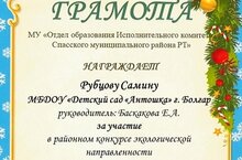 Наша воспитанница средней группы Рубцова Самина получила грамоту за участие в конкурсе "Альтернативная новогодняя ель". Педагог Баскакова Елена Александровна.