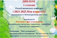 Наша воспитанница подготовительной группы Платонова София получила диплом 1 степени Республиканского конкурса. Педагог Платонова Анастасия Александровна.