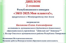 Наш педагог Баскакова Елена Александровна получила диплом 2 степени Республиканского конкурса. А также воспитанница средней группы Рубцова Самина также получила диплом 2 степени. Педагог Баскакова Елена Александровна.