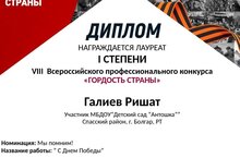 Наш воспитанник средней группы Галиев Ришат получил диплом 1 степени. Педагог Сабирова Алсу Исмагилловна.