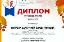 А наш педагог Петрова Валентина Владимировна получила дипломы руководителя за подготовку в участие в конкурсе осенних поделок наших малышей.