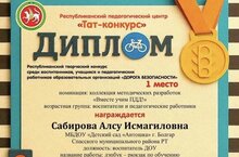 Наш педагог Сабирова Алсу Исмагилловна получила диплом за 1 место за участие в Республиканском конкурсе по ПДД.