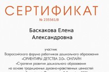 Наш педагог Баскакова Елена Александровна приняла участие во Всероссийском форуме работников дошкольного образования " Ориентиры детства 3.0" онлайн и получила сертификат участника.