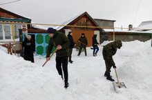Кадеты волонтёры помогаю убирать снег пожилым людям.