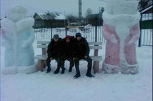 В этом году школьный двор превратился в сказочный городок. Здесь собрались главные герои Нового года: Дед Мороз, Снегурочка и Снеговик.