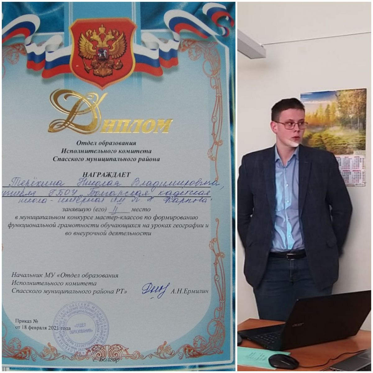 Учитель географии Терехин Н.В. награжден Дипломом II степени муниципального конкурса мастер-классов по формированию функциональной грамотности обучающихся на уроках географии и во внеурочной деятельности.