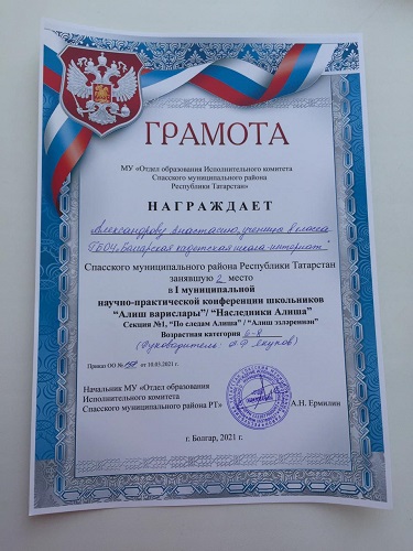 Опубликовано: 10.03.202110.03.21 проводилась первая муниципальная научно-практическая конференция школьников «Наследники Алиша».Была награждена Александрова Анастасия занявшая 2 место,возрастная категория 6-8 классы.