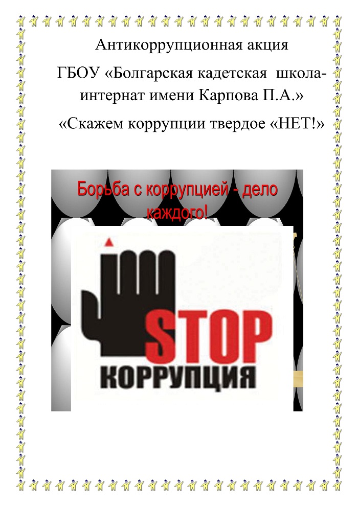 Опубликовано: 18.06.2022Учащиеся ГБОУ «Болгарская кадетская школа-интернат» имени Карпова П.А.» провели акцию распространив и разместив в своих социальных сетях плакат «Борьба с коррупцией –дело каждого»