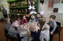 Детей разделили на три группы и по очереди водили в разные места: МБЦ (речной вокзал), музей чая, где находятся самовары. Ребята узнали историю создания самоваров, виды, значения. Из каких частей состоит самовар. Потом они играли: собирали мозаику и угадывали по картинкам название частей самовара. А в музее дворянства дети раскрашивали картинки с изображением самовара.