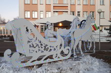 Возле школы появилась композиция из тройки коней с санями, а также ДМ, СН, символ года МЫШЬ и другие звери.