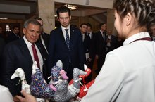 Осмотр президентом Республики Татарстан Р.Н.Минихановым выставки нашей школьной бизнес-компании на совместном заседании коллегии Министерства экономики РТ и Министерства промышленности и торговли РТ.