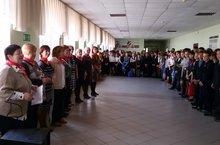 Сегодня утром всем педагогам и сотрудникам на входе в школу повязывали красный пионерский галстук, символ принадлежности к пионерской организации. И бывшие Пионеры весь день гордо носили его, рассказывая учащимся о пионерском движении, о своей пионерской молодости.