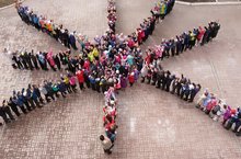 Учащиеся нашей школы образовали на пришкольной территории живую фигуру, изображающую солнце, ведь оно является символом мира, добра, надежды.