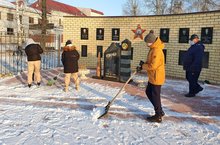 Ребята вооружились лопатами и метлами, чтобы очистить подход к памятнику воинам Афганской и Чеченской войн от снега.