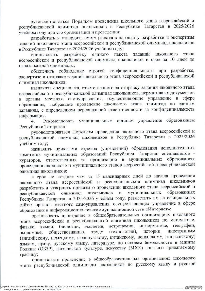 Приказ МОиН РТ "О проведении ШЭО 2025-26 2 страница 3 страница /Порядок проведения и Приложения школьногоэтапа всероссийской и республиканской олимпиад школьников в РТ в 2025-2026 учебном году