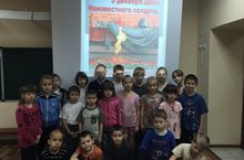 2 декабря воспитателями Павликовой Е.И., Низамовой А.С., Филипповой Ю.Л. была проведена беседа, посвящённая Дню Неизвестного солдата, целью которой стало воспитание патриотизма у воспитанников младшего школьного звена. Ребята узнали о том, что 3 декабря по всей стране установлена знаменательная дата. Ребята узнали о том, что огромнейшее количество солдат пропали без вести ,и,что день Неизвестного солдата это та дата, которая объединит всех пропавших без вести во время войн и военных конфликтов.