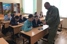 Встреча с председателем ветеранов ВДВ Спасского района, и участником боевых действий в Чечне , Костиным Алексеем Владимировичем. Алексей Владимирович рассказал ребятам о своей службе на Кавказе, показал фотографии свои и своих сослуживцев. Поделился тем, как он готовился к армии, занимался спортом, хорошо учился, это ему очень пригодилось, при отборе в ВДВ.