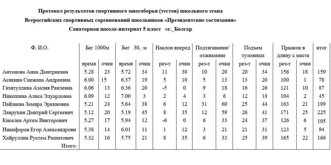 Протокол результатов спортивного многоборья (тестов) школьного этапа спортивных соревнований школьников (протокол)