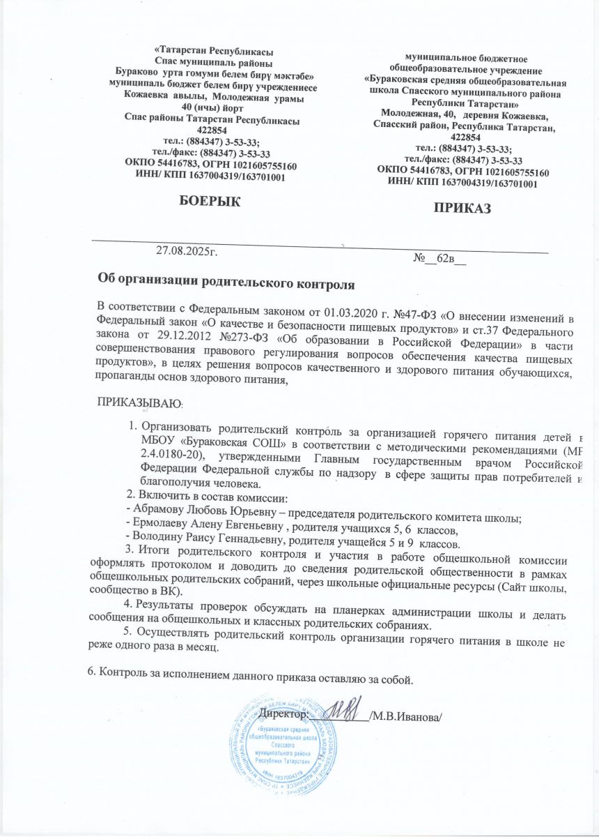 Приказ об организации родительского контроля на 2025-2026 учебный год