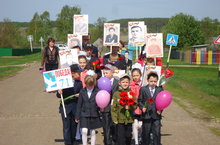 Бәйрәм көнне мәктәп укучылары -"Үлемсез полк" акциясендә үзләренең дәү әтиләрен, әбиләренең портретларын күтәреп авыл урамы буенча хәтер яңартып һәйкәл янына бардылар.