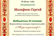 20 февраля воспитатели МБДОУ "Дтский сад с.Никольское" приняли участие во всероссийском конкурсе "Ай да скульптор". Воспитанникам и Педагогам были присвоены дипломы за активное участие и творческие успехи в конкурсе "Ай да скульптор". Малафеев Сергей награжден дипломом победителя второй степени Всероссийского конкурса творческих работ "Ай да скульптор!"