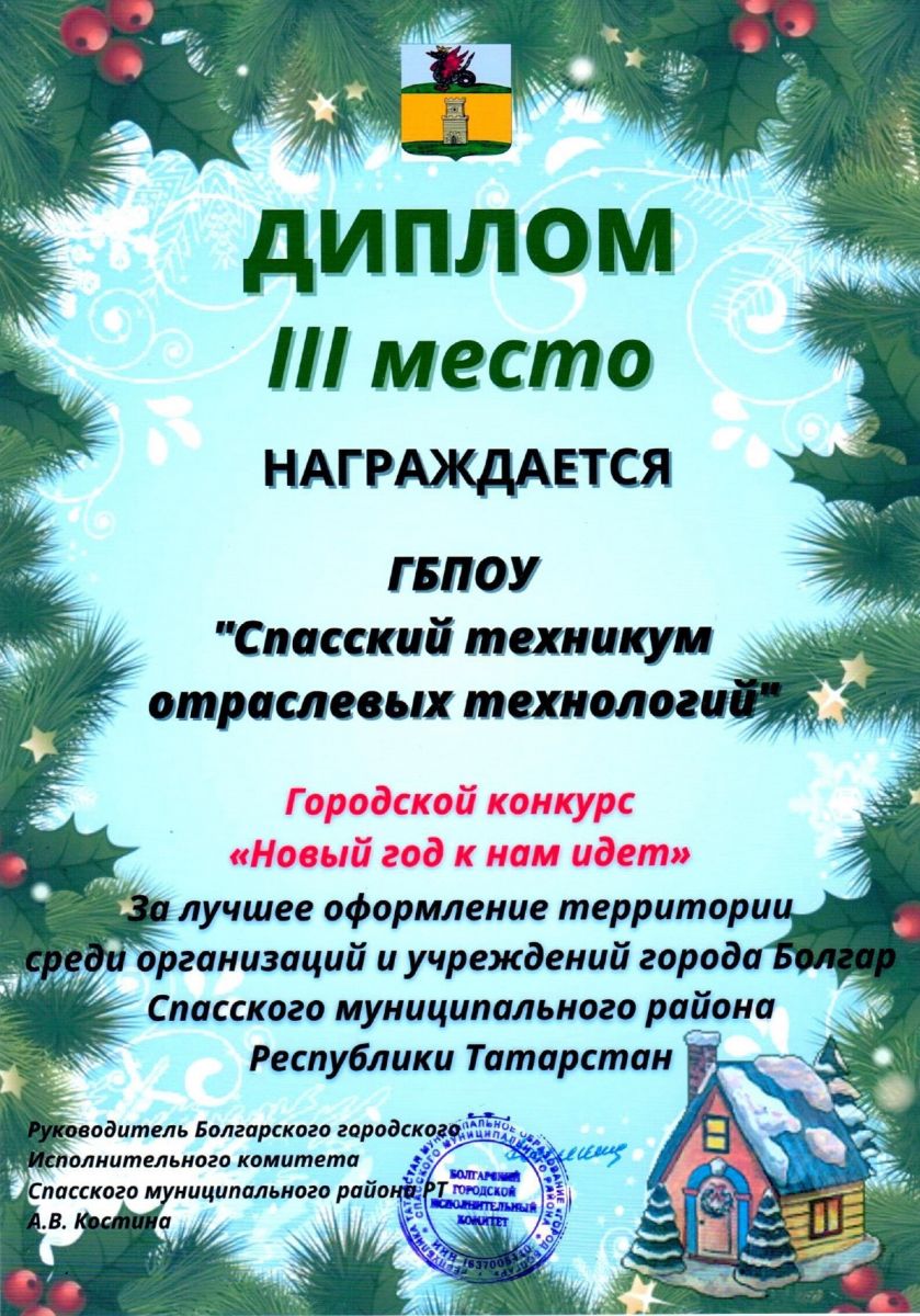 Опубликовано: 27.12.2021Дипломом 3 степени и сертификатом на посещение бассейна и тренажерного зала награжден Спасский техникум отраслевых технологий за лучшее оформление территории среди организаций и учреждений города Болгар Спасского муниципального района. Конкурс проводился Болгарским исполнительным комитетом Спасского муниципального района.