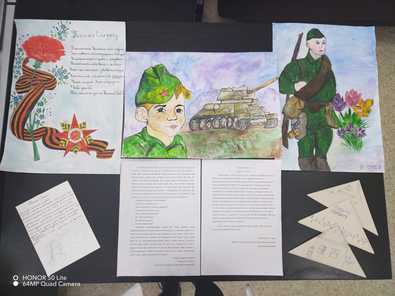 Опубликовано: 17.10.202217 октября 2022г. проходит Всероссийская акция "Письмо солдату" в рамках "Урока Мужества". Студенты нашего техникума приняли активное участие в данной акции, написали письма и нарисовали рисунки военнослужащим Российской Армии.