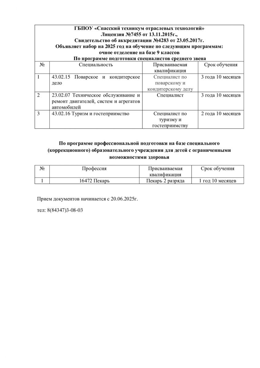❗Внимание! С 20 июня 2025 года в ГБПОУ "Спасский техникум отраслевых технологий" стартует прием документов на обучение.