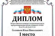 Поздравляем с победой Соловьева Илью (обучающийся объединения "Цифровая грамотность"), занявшего I место во Всероссийском конкурсе медиатворчества и программирования среди учащихся "24bit".