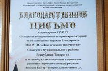 17 апреля на базе ГБУК РТ «Болгарский государственный историко-архитектурный музей-заповедник» состоялось торжественное награждение победителей районного творческого конкурса рисунков «Великий Болгар-истории дыхание живое…», посвященного Международному дню памятников и исторических мест. Педагогический коллектив Дома детского творчества награжден благодарственным письмом за активное участие в подготовке и проведении конкурса.