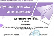 Спикер Детской районной Думы Костина Анна награждена сертификатом участника в республиканском конкурсе социальных проектов «Лучшая детская Инициатива».