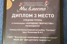 «Чувашский фольклорный ансамбль «Сеспель», ДДТ на базе Болгарской санаторной ШИ - лауреат I степени