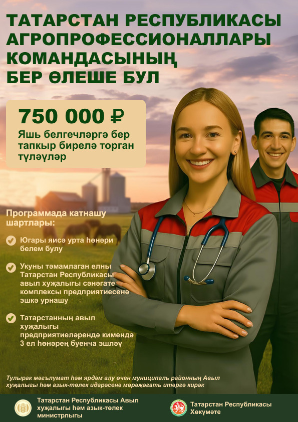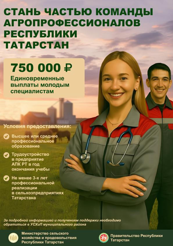 Министерством сельского хозяйства и продовольствия Республики Татарстан в соответствии с постановлением Кабинета Министров Республики Татарстан от 21.11.2017 № 893 «О мерах государственной поддержки кадрового обеспечения агропромышленного комплекса за счет средств бюджета Республики Татарстан» для обеспечения предприятий АПК квалифицированными специалистами оказывается господдержка в размере 750,0 тыс. рублей молодым специалистам имеющим высшее или среднее профессиональное образование, взявшим на себя обязательства работать в сельскохозяйственных организациях не менее трех лет.