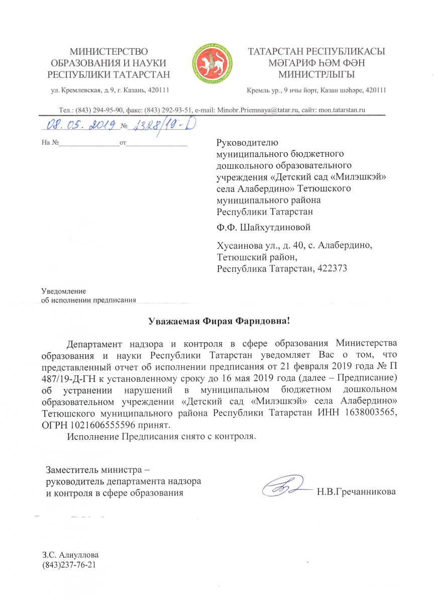 Отчет об исполнении предписания ТО Управления Роспотребнадзора по РТ в Буинском, Тетюшском районах