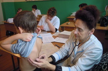 Сегодня бригада врачей Тетюшской ЦРБ из 5 человек в школе провели очередной медицинский осмотр учащихся. Данные ЭКГ, анализы крови и другие процедуры показали хорошее состояние здоровья учащихся. По данным районного педиатора Тимофеевой Т.А. 77% учащихся относятся к 1 группе здоровья, 23 % учащихся к 2 группе.