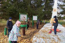 В рамках акции "Осенняя неделя добра" обучающиеся вместе учителями привели в порядок территорию обелиска, очистили от сухих цветов и листьев.