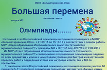 Учащиеся 10 -ых классов выпустили второй номер общешкольной газеты "Большая перемена". В газете можно узнать фамилии победителей школьного этапа предметных олимпиад, десятиклассники выразили свое мнение о дне самоуправления и решили,что профессия учителя очень трудная. Так же в газете можно увидеть кадры с осеннего бала.