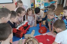 В первом зале "Картинной галерее" дети рассмотрели картины и обсудили причины возникновения пожаров. В следующем зале побеседовали о профессии пожарного и о том, что ему помогает бороться с огнем. В кинозале дети посмотрели видеоролик "Пожарные на учении". Затем провели эксперимент и сделали соответствующие выводы. -