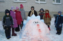 Снежные фигуры. 23.12.2014 Около нашей школы появились снежные фигуры герои - смешарики: Нюша, Лосяша, Ёжик и другие.